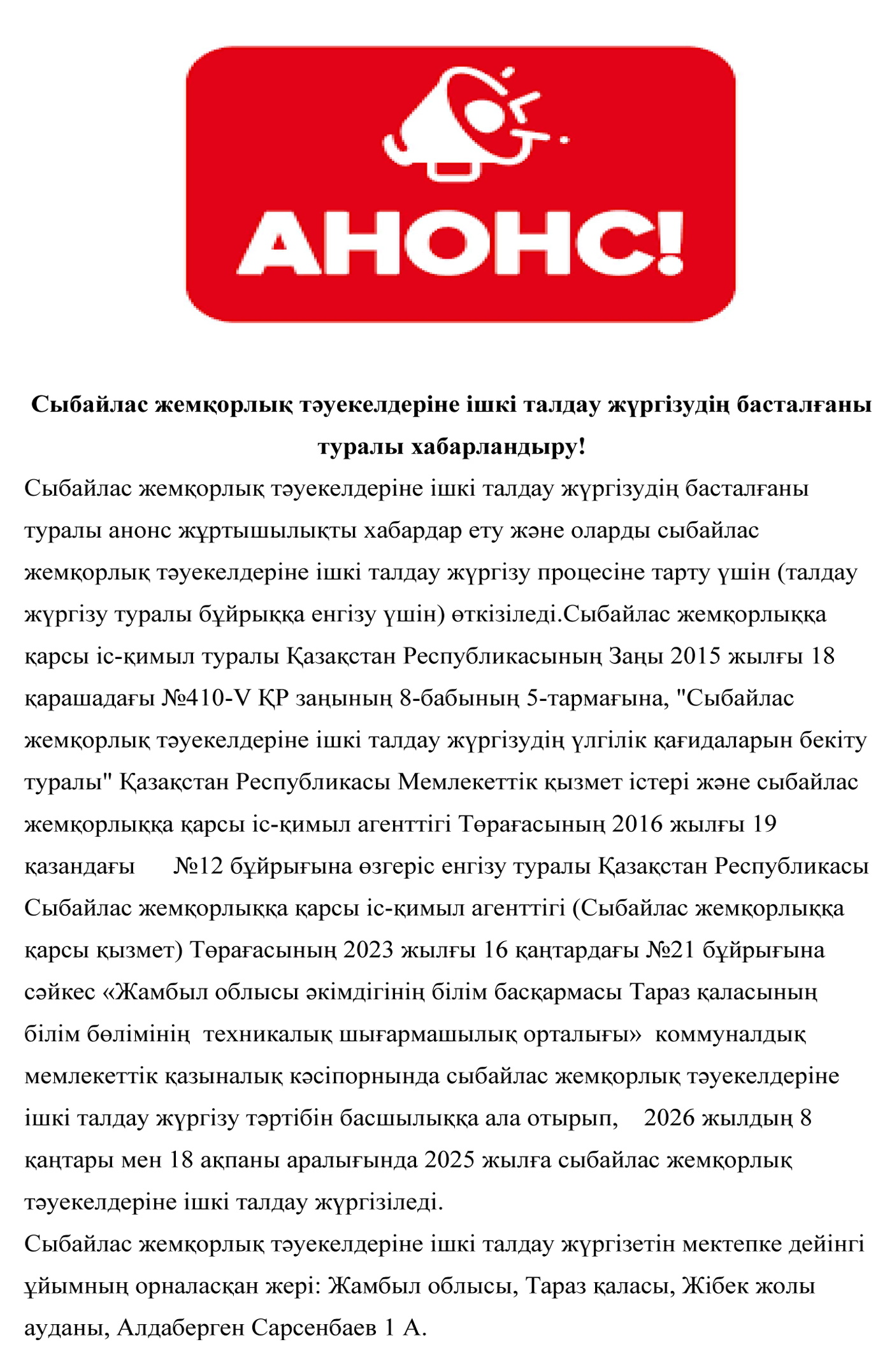 ул. А.Сарсенбаева 1А г. Тараз